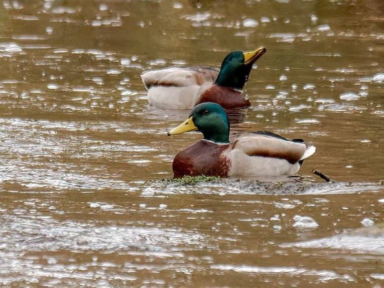 It is here, on this late winter day, that a pair of Mallard ducks drift together through the slow current, their presence a small, vivid note of life against the subdued palette of the season.